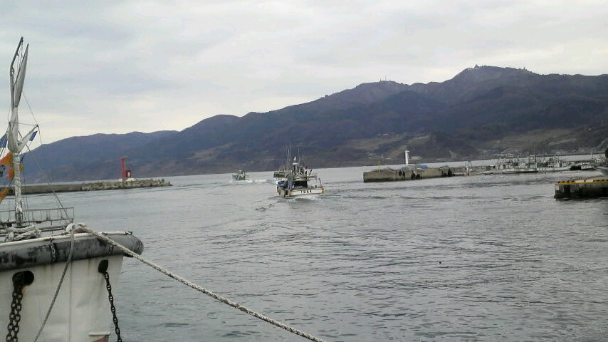 January 17, 2012 初凪〜2012 昨日までの大風はだいぶ弱まったものの 波もまだまだ荒く、夜もが明けきらぬ中、 輪島港の大部分の船が出漁していきました! 天気予報では、明日にはもう次の低気圧が発生し 再び冬型の気圧配置にもどるとか・・・(/_;) なにせ、しばしの凪、 漁師さんたちは新鮮な魚を食卓へ届けるべく さぶぅ〜いなか、頑張っています。。。(^_-)-☆ ブログランキングに参加中です! クリックして頂けたら励みになるので↓↓↓っとお願いします(*^^)v タグ :#出漁#天気予報#大漁祈願